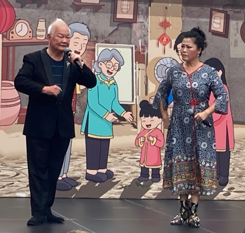 On the void deck of an apartment block, as strangers pass on the footpaths outside, two mummers in heroic masks gently dance around a table, where a framed photo of a smiling businesswoman stands, as a congregation of ageing men watch silently in mourning.