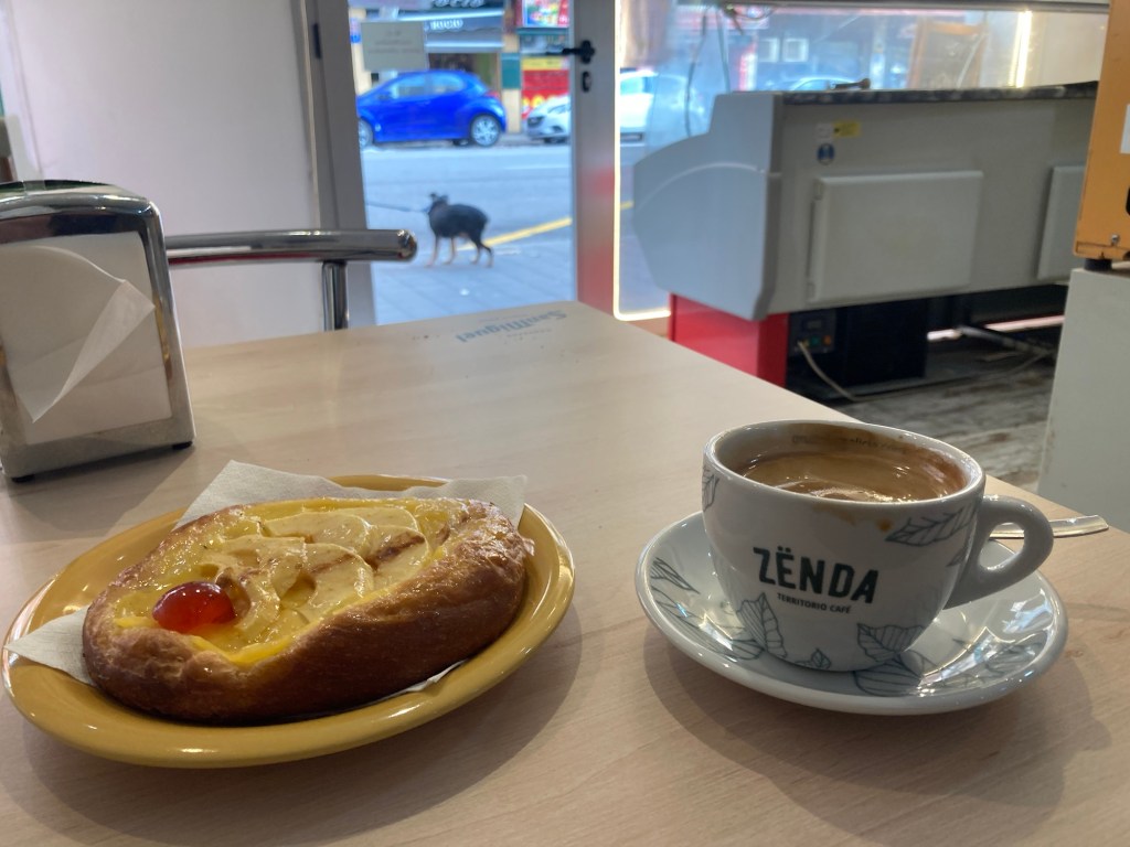 The pastry that comes with your own coffee is as tender as petals, brushed with custard, topped with apple and a cherry as red as Christmas.