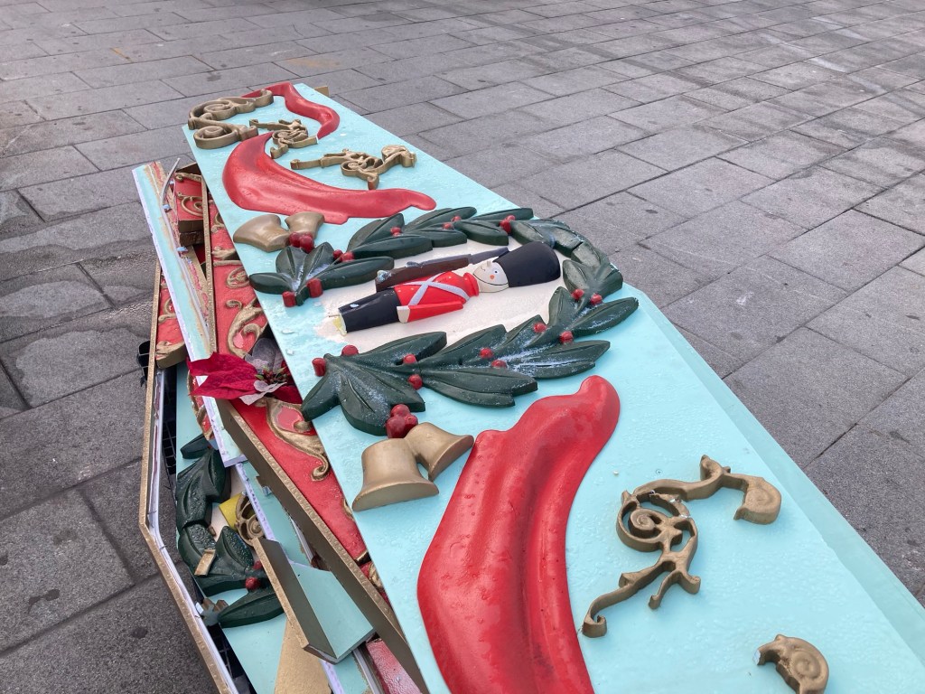 A painted panel from a disassembled Christmas kiosk lies stacked like a coffin lid complete with a Nutcracker, eyes forward, awaiting the toy funeral.